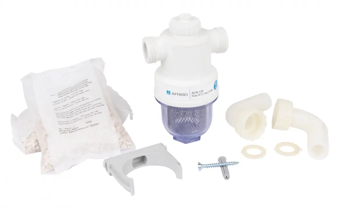 ACN 120 G3/4" x 20 mm CaCO3 Afriso neutralizátor kondenzátu 1112000 Neutralizátor ACN 120, G3/4" x 20 mm, CaCO3, pro kotle do 35 kW. Instaluje se pod kotel, neutralizuje pH kondenzátu. Plášť PA66, průhledná usazovací nádrž, snadné připojení. Obsahuje další granule CaCO3. SKU: AFR-1112000