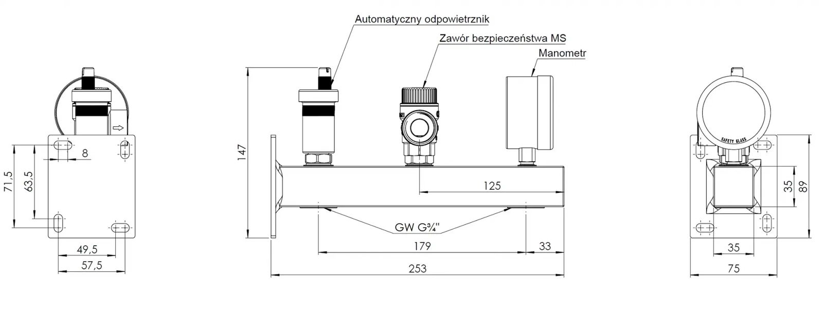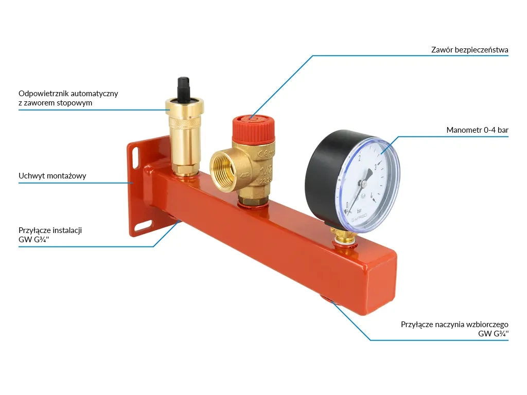 Bezpečnostní skupina kotle BSS, Nmax UDT 42,6 kW, s pojistným ventilem MS 1,5 bar, s připojením na expanzní nádobu