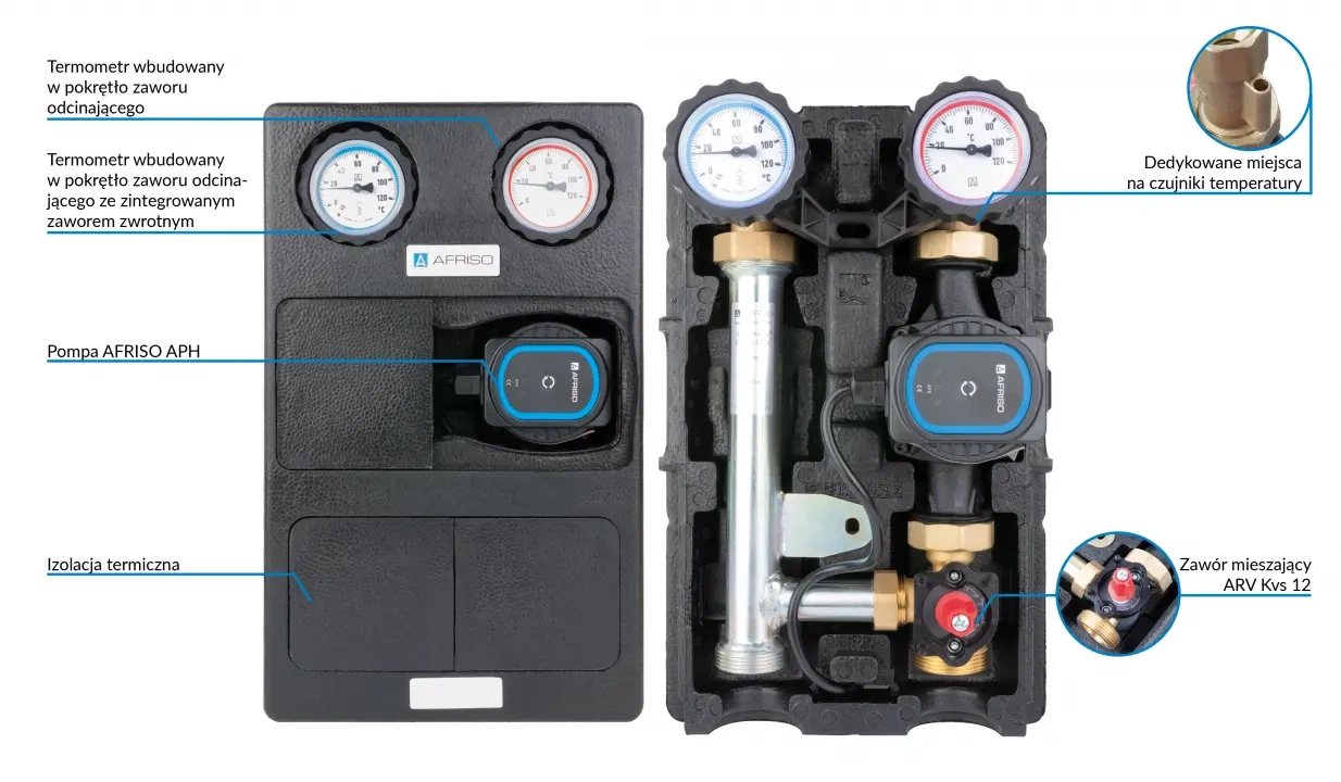 • Vybaveno potřebnými součástmi: teploměry, zpětným ventilem, uzavíracími ventily na přívodním a vratném potrubí a tepelnou izolací.