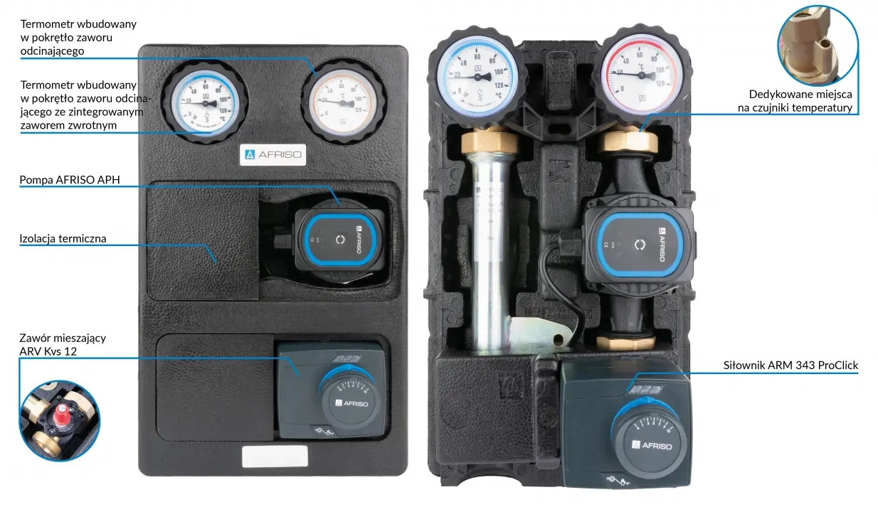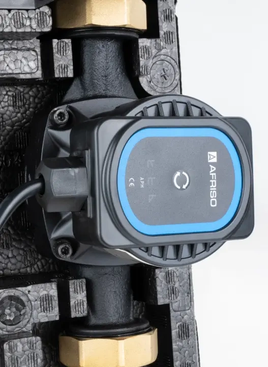 Kratší, kompaktnější verze skupin PrimoTherm.Vybaveno potřebnými součástmi: teploměry, zpětným ventilem, uzavíracími ventily na přívodním a vratném potrubí a tepelnou izolací.Instalován směšovací ventil ARV Kvs12, čerpadlo AFRISO APH 25-7/180 a pohon ARM 343 ProClick (3bodový, 230 V, 120 s).Přívodní a zpětný kabel lze snadno zaměnit.Technická data