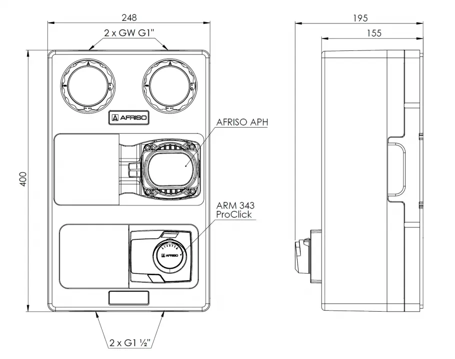 připojení ze strany instalace: 2x GW G1"připojení na straně rozdělovače: 2x G1½"oběhové čerpadlo: AFRISO APH 361 25-7/180 mmmaximální teplota média: 90°Cmaximální tlak: 10 barrozteč přípojek k rozdělovači: 125 mmKvs směšovací ventil: 12 m³/hZáruka výrobce na 3 roky