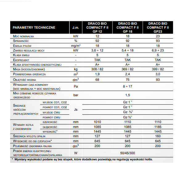Draco Bio Compact FII GP je nejnovějším modelem řady kotlů na pelety společnosti TEKLA. Zařízení se vyznačuje moderním designem, barevným provedením a bohatou výbavou. Kompaktní, kompaktní konstrukce a malé rozměry umožňují instalaci i v malých kotelnách. Model GP je standardně vybaven hydraulikou pro 2 topné okruhy a okruh TUV. Hydraulický systém se skládá z: čerpadlo topného okruhu se směšovacím ventilem a pohonem, čerpadlo TUV, čerpadlo ochrany proti zpětnému toku, membránová nádoba o objemu 8 l., pojistný ventil, elektronický snímač tlaku systému CH pro řízení provozu topného systému. Kotel lze připojit přímo k topnému systému v otevřeném i uzavřeném systému v souladu s platnými normami, aniž by bylo nutné další zařízení pro sběr přebytečného tepla. Draco Bio Compact FII GP je vybaven samočisticím automatickým hořákem FIREBLAST II a jeho provoz je řízen moderním ovladačem ESTYMA TOUCH s barevným dotykovým displejem.Vybavení kotle: