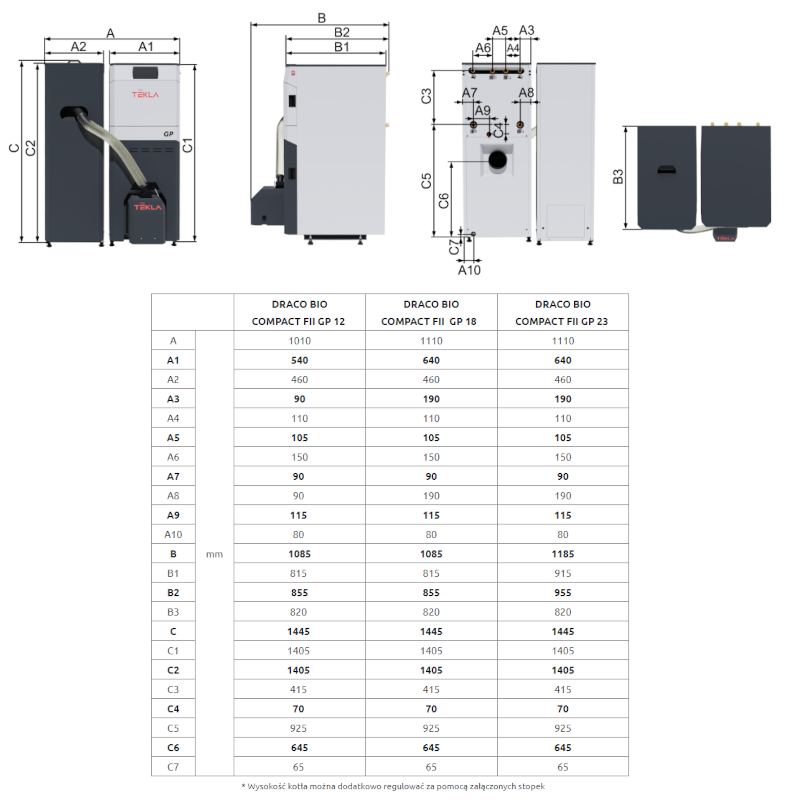 Draco Bio Compact FII GP je nejnovějším modelem řady kotlů na pelety společnosti TEKLA. Zařízení se vyznačuje moderním designem, barevným provedením a bohatou výbavou. Kompaktní, kompaktní konstrukce a malé rozměry umožňují instalaci i v malých kotelnách. Model GP je standardně vybaven hydraulikou pro 2 topné okruhy a okruh TUV. Hydraulický systém se skládá z: čerpadlo topného okruhu se směšovacím ventilem a pohonem, čerpadlo TUV, čerpadlo ochrany proti zpětnému toku, membránová nádoba o objemu 8 l., pojistný ventil, elektronický snímač tlaku systému CH pro řízení provozu topného systému. Kotel lze připojit přímo k topnému systému v otevřeném i uzavřeném systému v souladu s platnými normami, aniž by bylo nutné další zařízení pro sběr přebytečného tepla. Draco Bio Compact FII GP je vybaven samočisticím automatickým hořákem FIREBLAST II a jeho provoz je řízen moderním ovladačem ESTYMA TOUCH s barevným dotykovým displejem.Vybavení kotle: