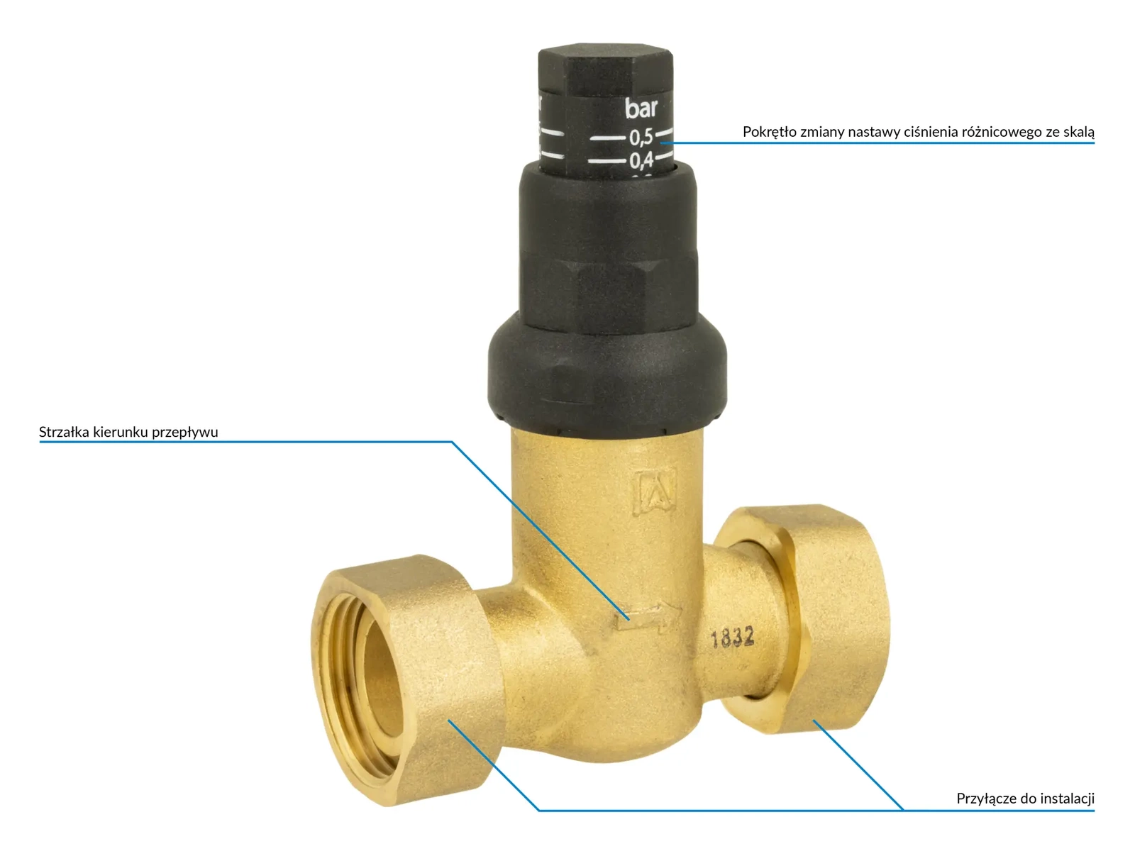 Diferenční tlakové pojistné ventily DU se používají v uzavřených topných systémech v souladu s PN-EN 12828 k udržení konstantního dostupného tlaku v instalaci. Při zvýšení tlaku, například při zavřených ventilech radiátorů, přebytečné médium proudí do zpětného potrubí. Odvzdušňovací ventily také pomáhají snížit hluk v instalaci a udržovat konstantní minimální průtok čerpadlem a zdrojem tepla.Popis