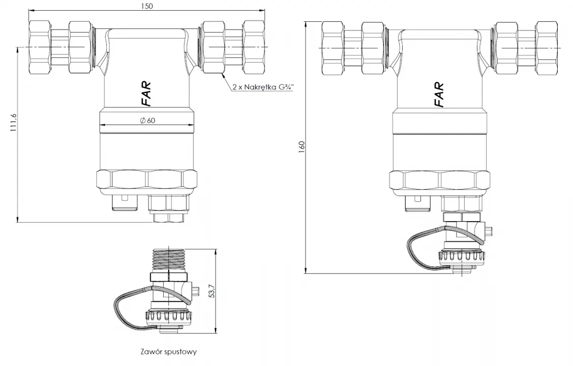 • Separátor nečistot FAR 402: Pro instalace ústředního topení, odstraňuje pevné nečistoty, mosaz, vypouštěcí ventil, neodymový magnet, max. 110°C, 10 bar.
