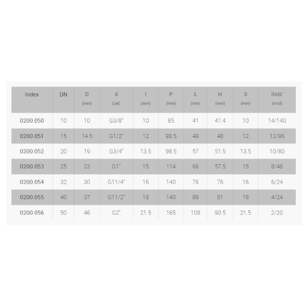 • Index DN D (mm) d (palec) l (mm) P (mm) L (mm) H (mm) S (mm) Množství (m/d)