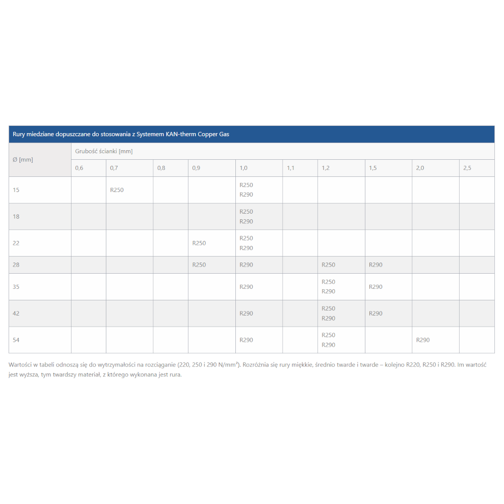 Měděné trubky použité v systému KAN-therm Copper Gas musí splňovat požadavky normy EN 1057 R220/R250/R290. Kování systému je vyrobeno z mědi CU-DHP (CW024A) a bronzu 2.109.Alternativa k pájení