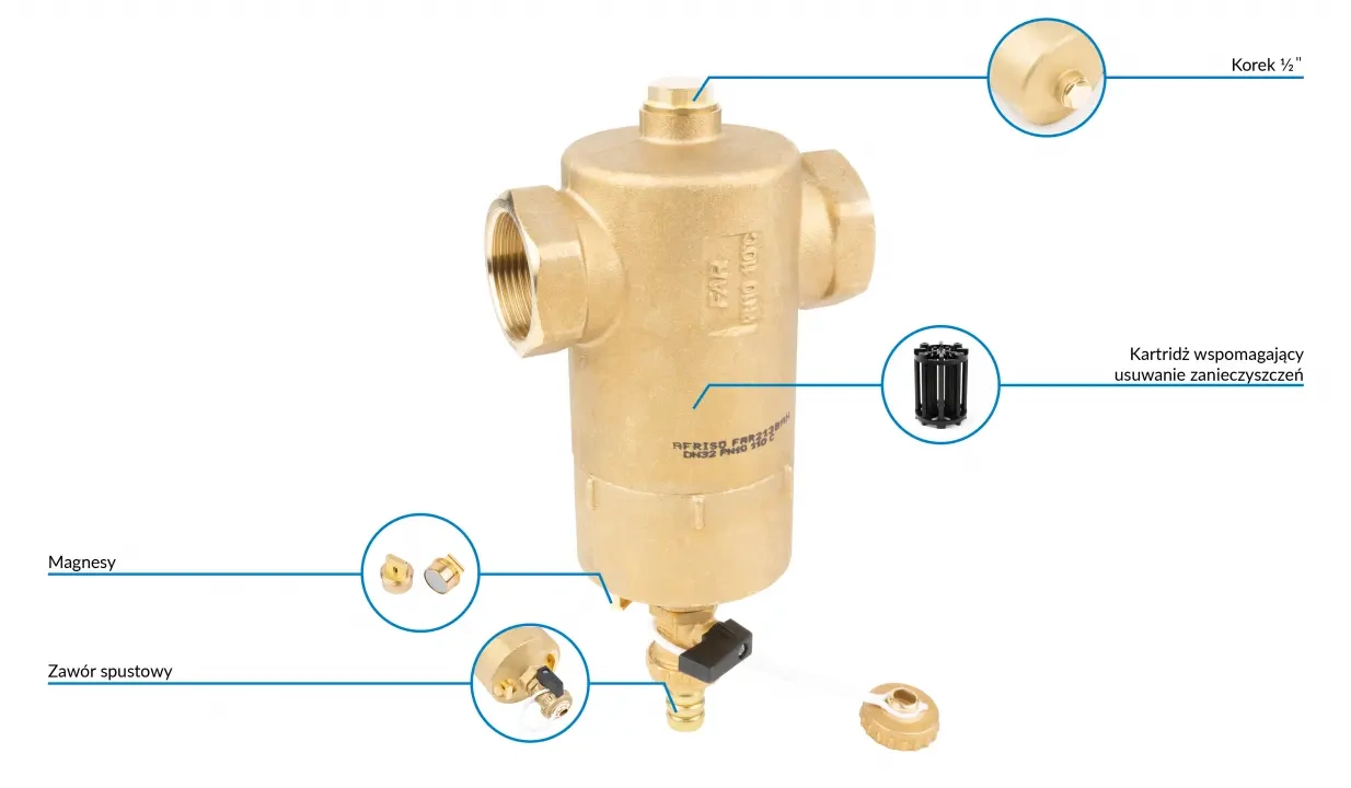 Mosazné pouzdro.Vypouštěcí ventil odstraňuje nečistoty vysrážené z média.Neodymové magnety odstraňují kovové nečistoty.Záruka výrobce na 3 roky