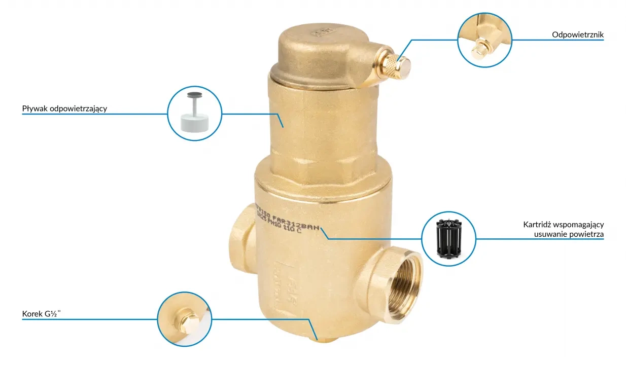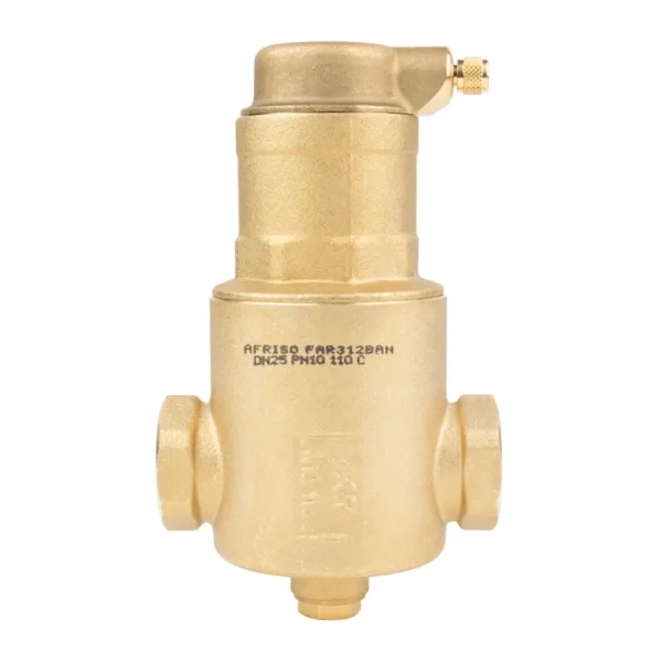 - Separátor vzduchu FAR 312 Rp1'': Pro instalace ústředního topení/chlazení, odstraňuje vzduch, automatický odvzdušňovací ventil, max. 110°C, 10 bar, mosaz.