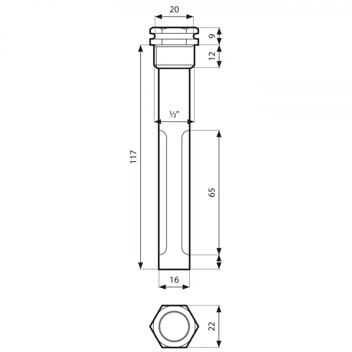 • Ponorné pouzdro Fi 15 x 16 mm: měď, odděluje snímač teploty od středního, G½", rychlé vedení tepla, maximální tlak 6 bar.