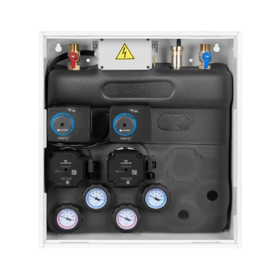 Prefabrikované řešení připravené k instalaci uzavřené v kovové, estetické skříni.Vybaveno čerpadly Grundfos UPM3 a rotačními ventily s elektrickými pohony ARM 141.Nahrazuje složité instalace se spojkami, rozdělovači, směšovacími ventily - 80% kotelny v jedné skříni.Organizuje a zjednodušuje celou instalaci.Kontrolováno a testováno na těsnost, hydraulické a elektrické.Položky dodávky