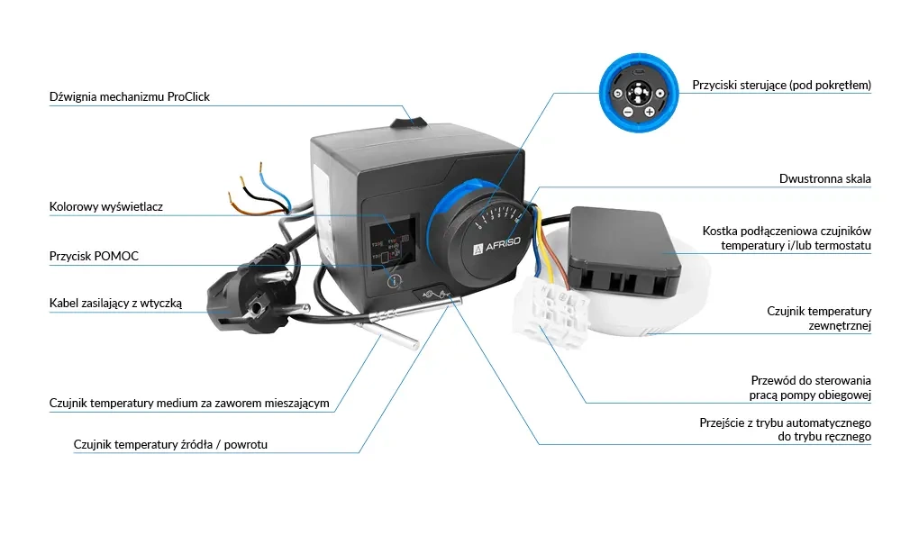 6 naprogramovaných hydraulických schémat: s 3-cestným ventilem na přívodu, pro připojení dalšího regulátoru v BUS komunikaci, se 4-cestným ventilem.Možnost pracovat v manuálním režimu.Program podlahového vytápění.Možnost změny teploty v závislosti na dni v týdnu a času.Položky dodávkyČidlo teploty média za směšovacím ventilem (1 m).Čidlo teploty zdroje tepla/chlazení (3 m).Senzor venkovní teploty.Kabel pro ovládání oběhového čerpadla (0,5 m).Napájecí kabel se zástrčkou (2 m).Technická data