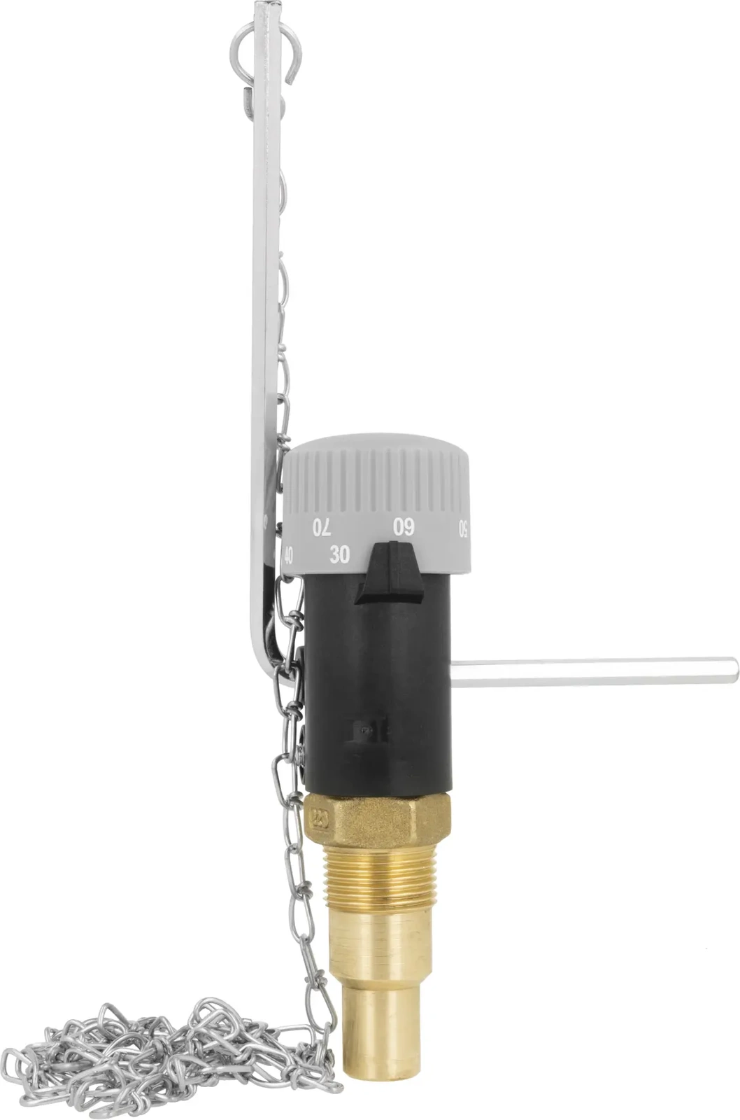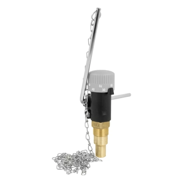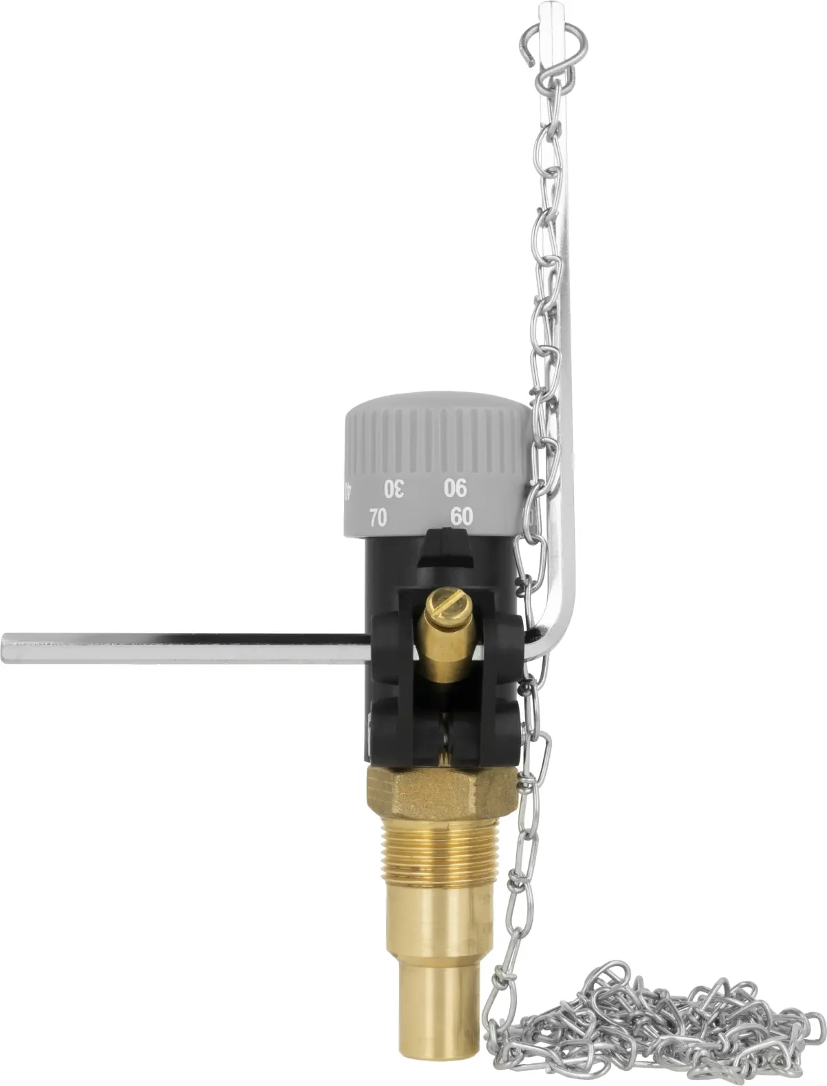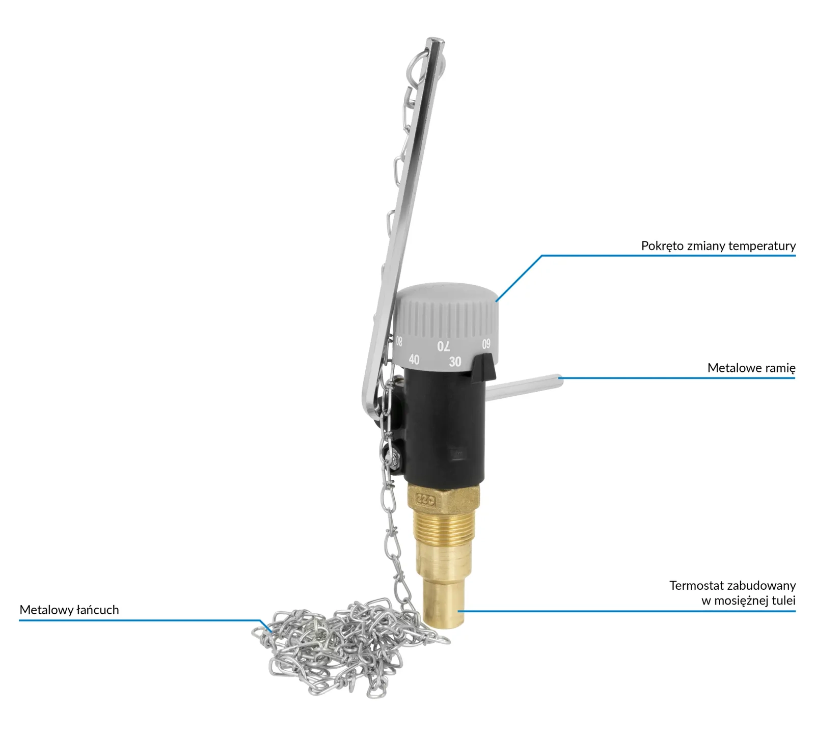 • Vyrobeno z termostatu zabudovaného v mosazném pouzdru, knoflíku a kovového ramene s řetízkem.