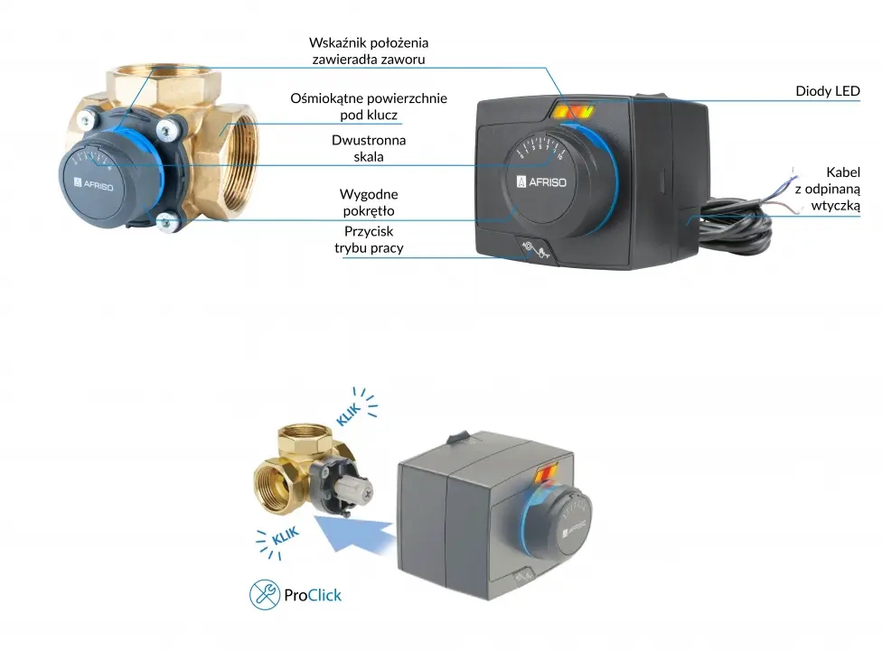 - ProClick: Sada ARV 485 se 4cestným směšovacím ventilem, DN 32, Kvs 16, a ARM 343 Pohon pro kotle na tuhá paliva, automatizace, montáž bez nářadí.