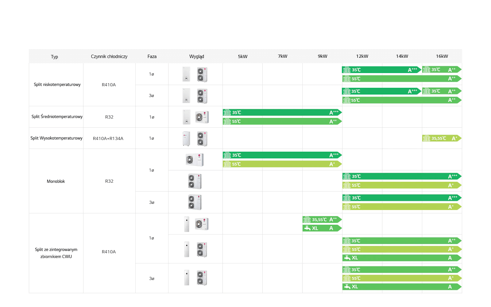 Rozsah kapacity (kW) | (1Ø) 4 / 6 | (1Ø) 5,5 / 7 / 9 | (1Ø) 4 / 6 | (1Ø) 5,5 / 7 / 9 | (1Ø&3Ø) 12 / 14 / 16 | (1Ø) 16 |