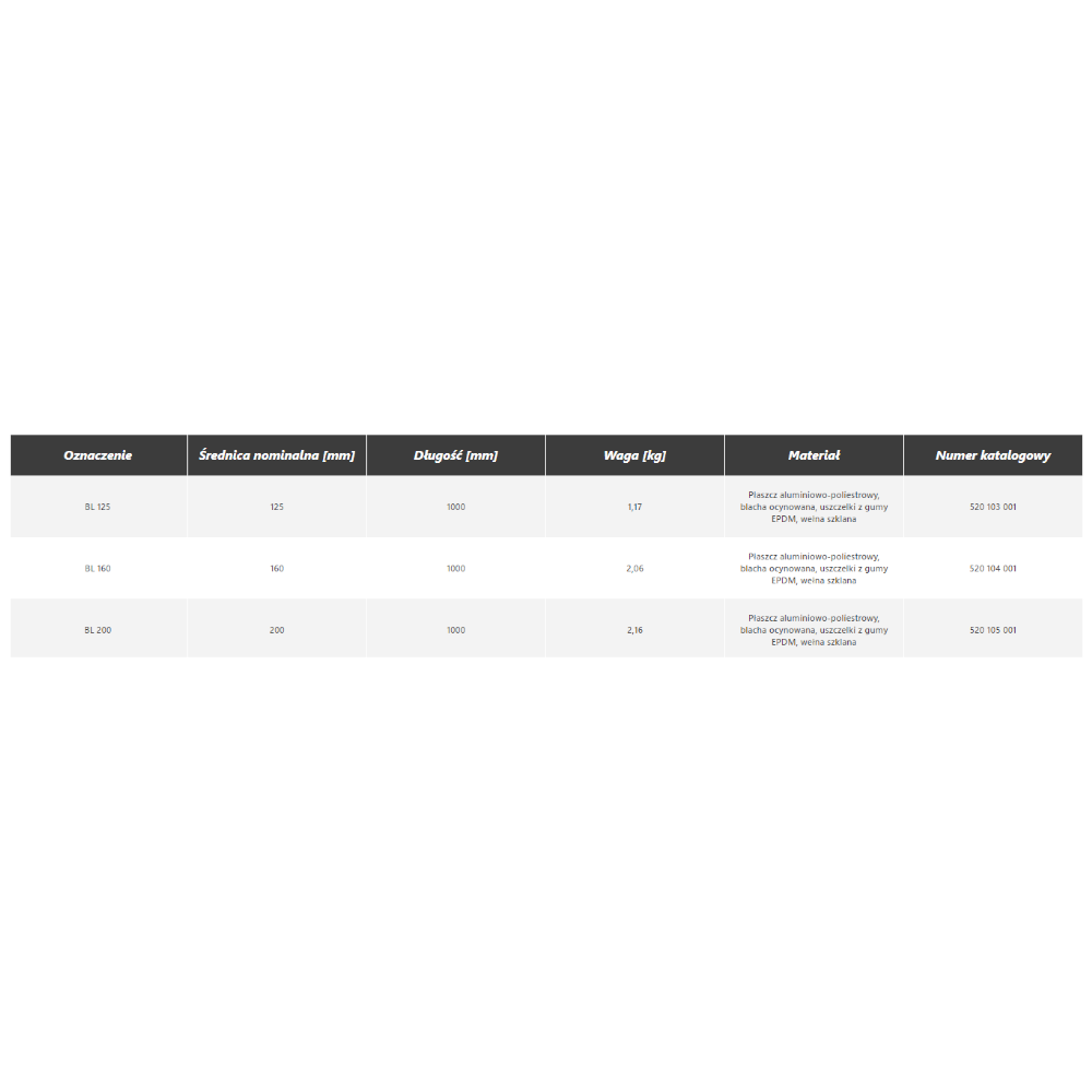 BL 160 | 160 | 1000 | 2,06 | Hliníkový/polyesterový plášť, pocínovaný plech, těsnění z pryže EPDM, skelná vata | 520 104 001 |